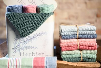 Solwang DesignFlotte kjøkkenhåndklær med farger i striper. Matchende kjøkkenkluter fra samme leverandør.