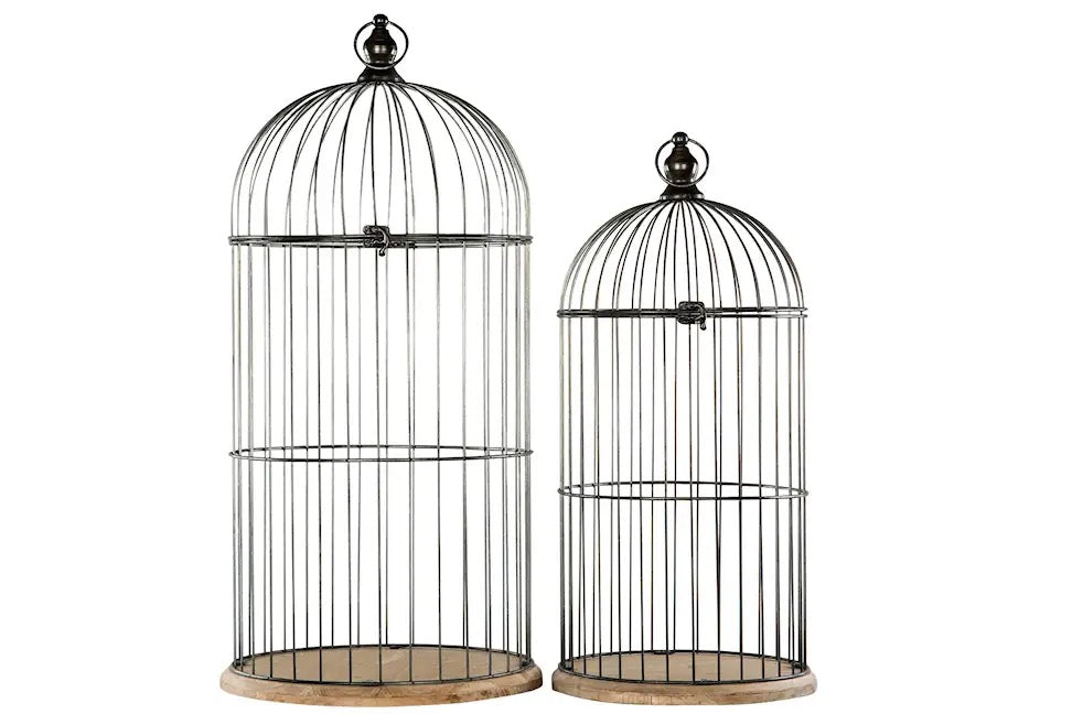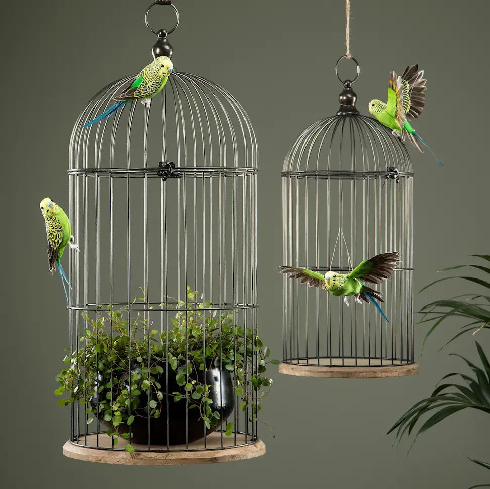 Sett med to bur som kan henge opp eller stilles på et bord eller benk. Perfekt for ulika planter og dekorasjoner. Laget i metall og tre i bunnen.