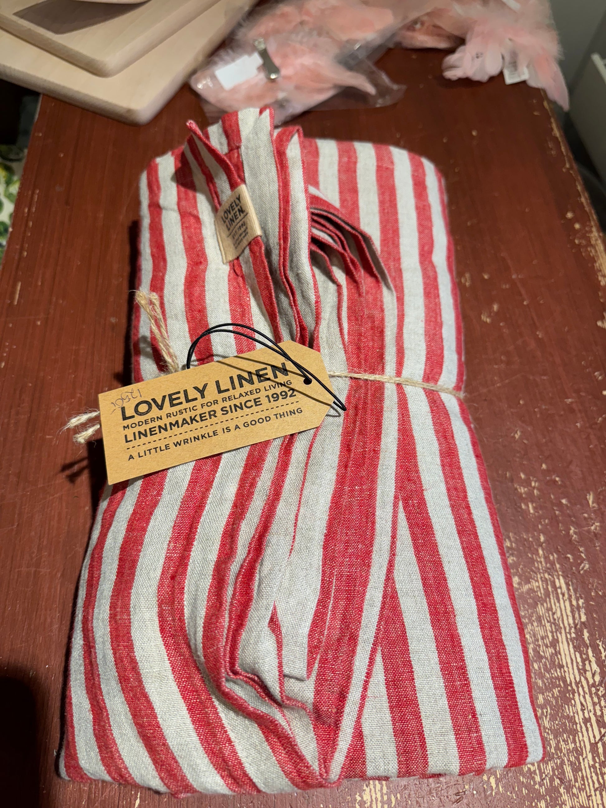 Det finnes linservietter, kjøkken håndkle og forkle i stripet eller rutet , begge to er nydelige å se på.