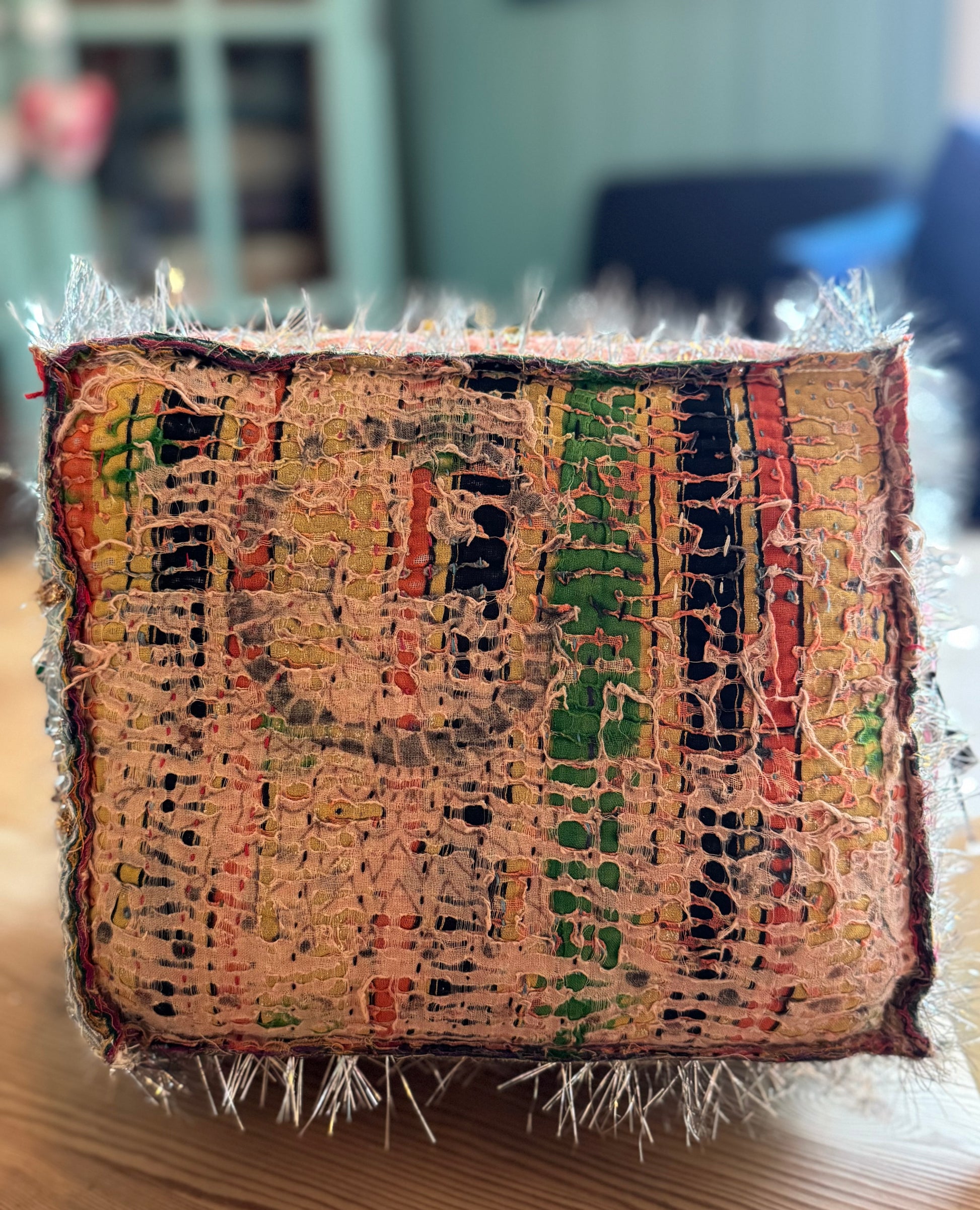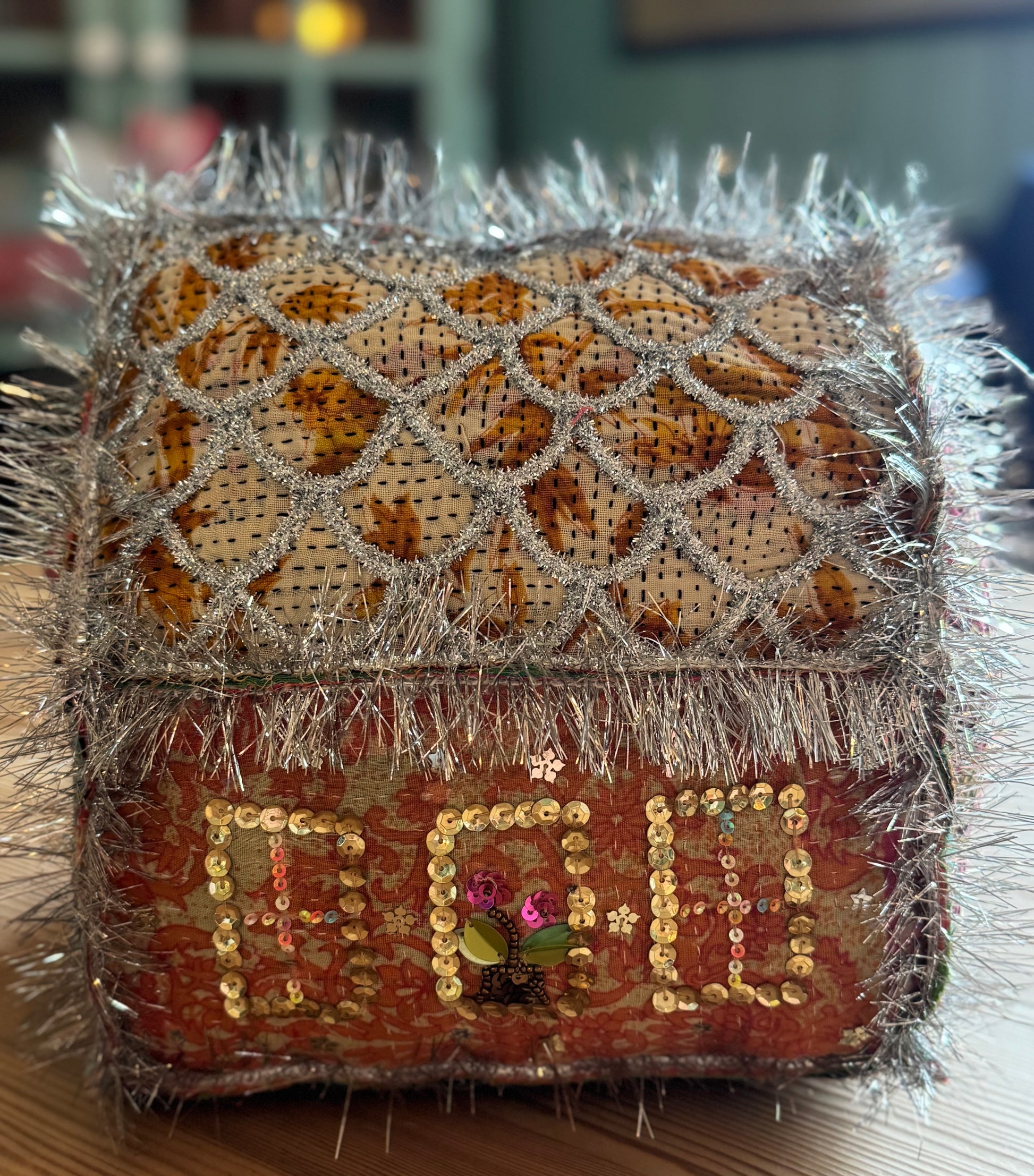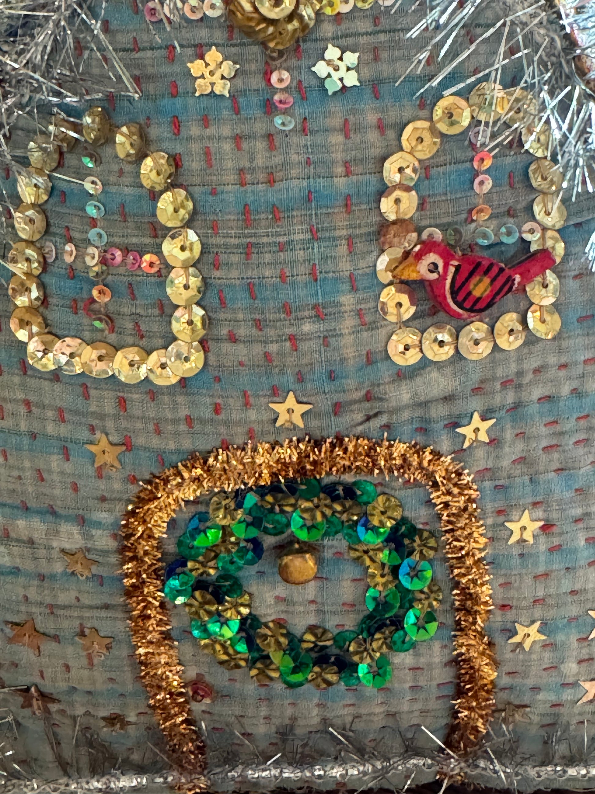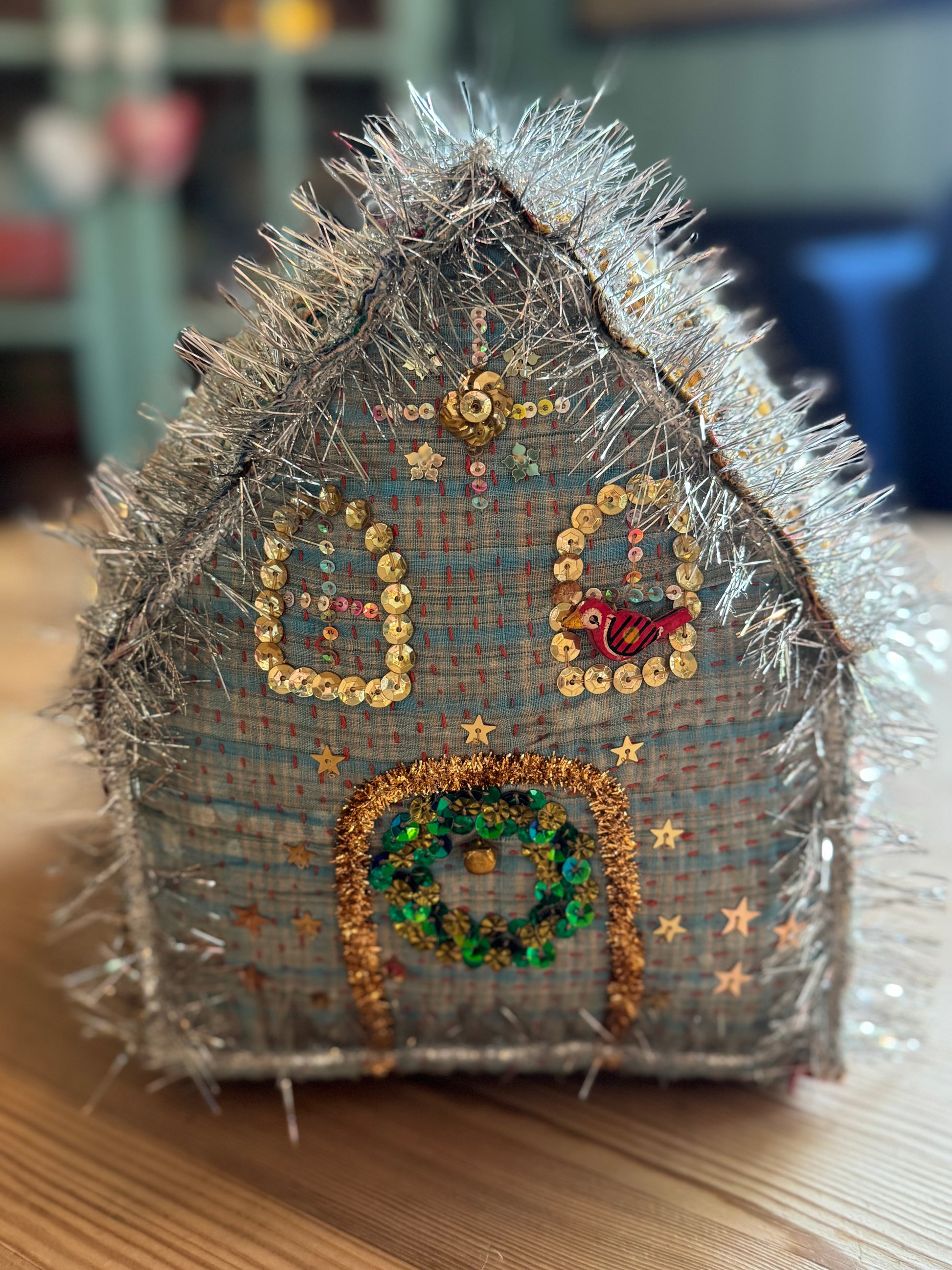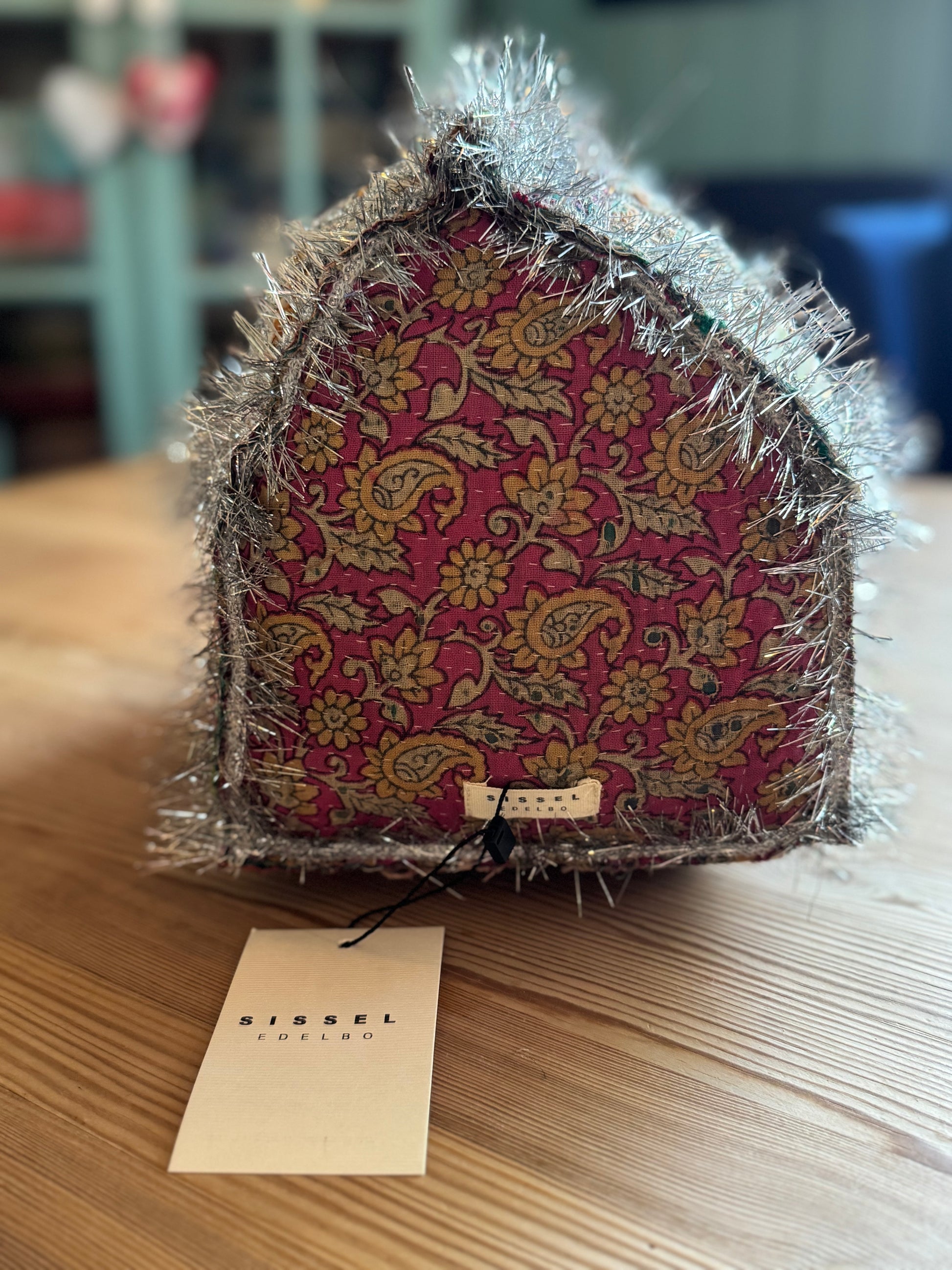 Gøyal pynt sydd for hånd , skikkelig forseggjort hus med mange små perler og annen påsydd pynt. Båndet er i sølvfrynser og krans på døren med perler og strass