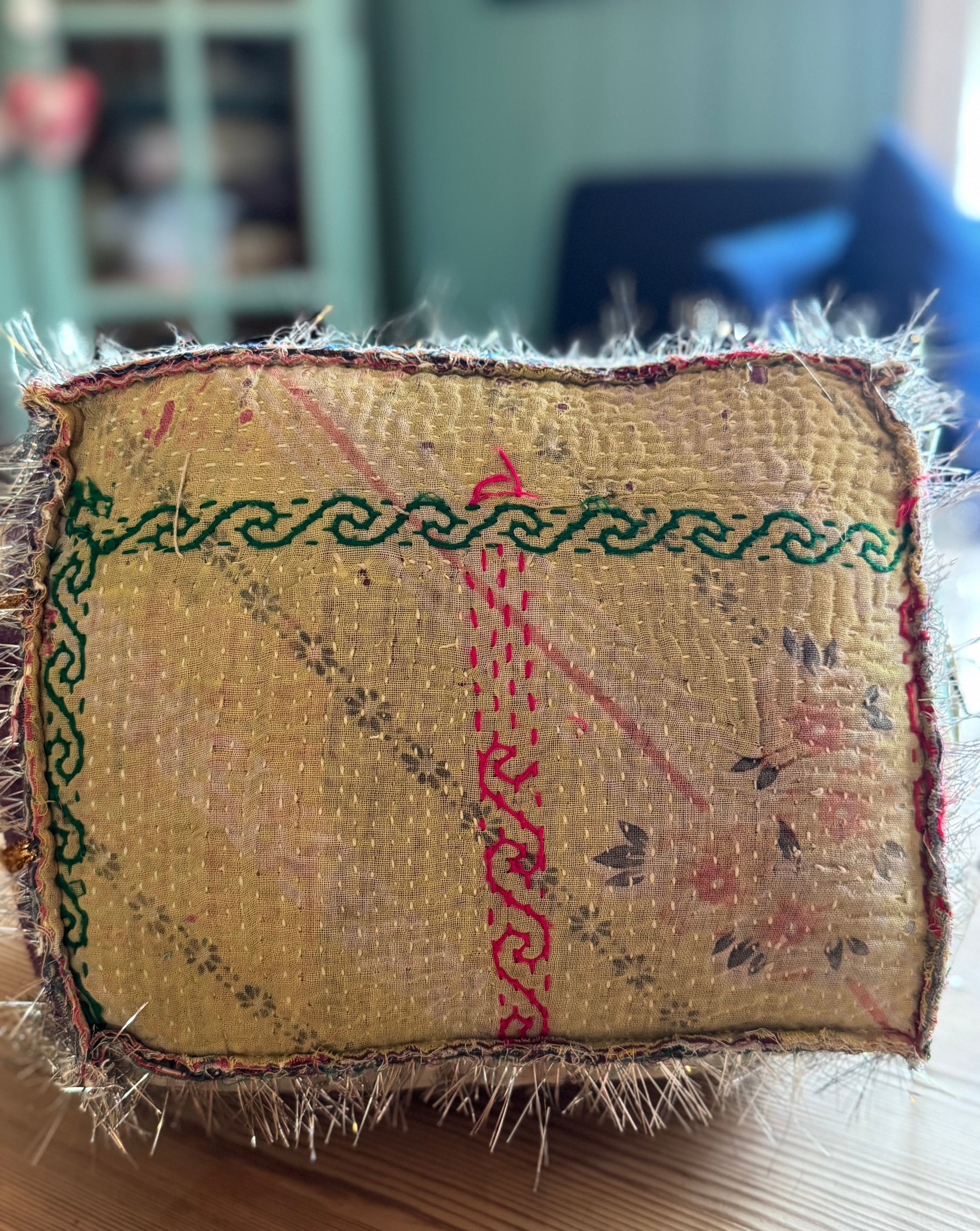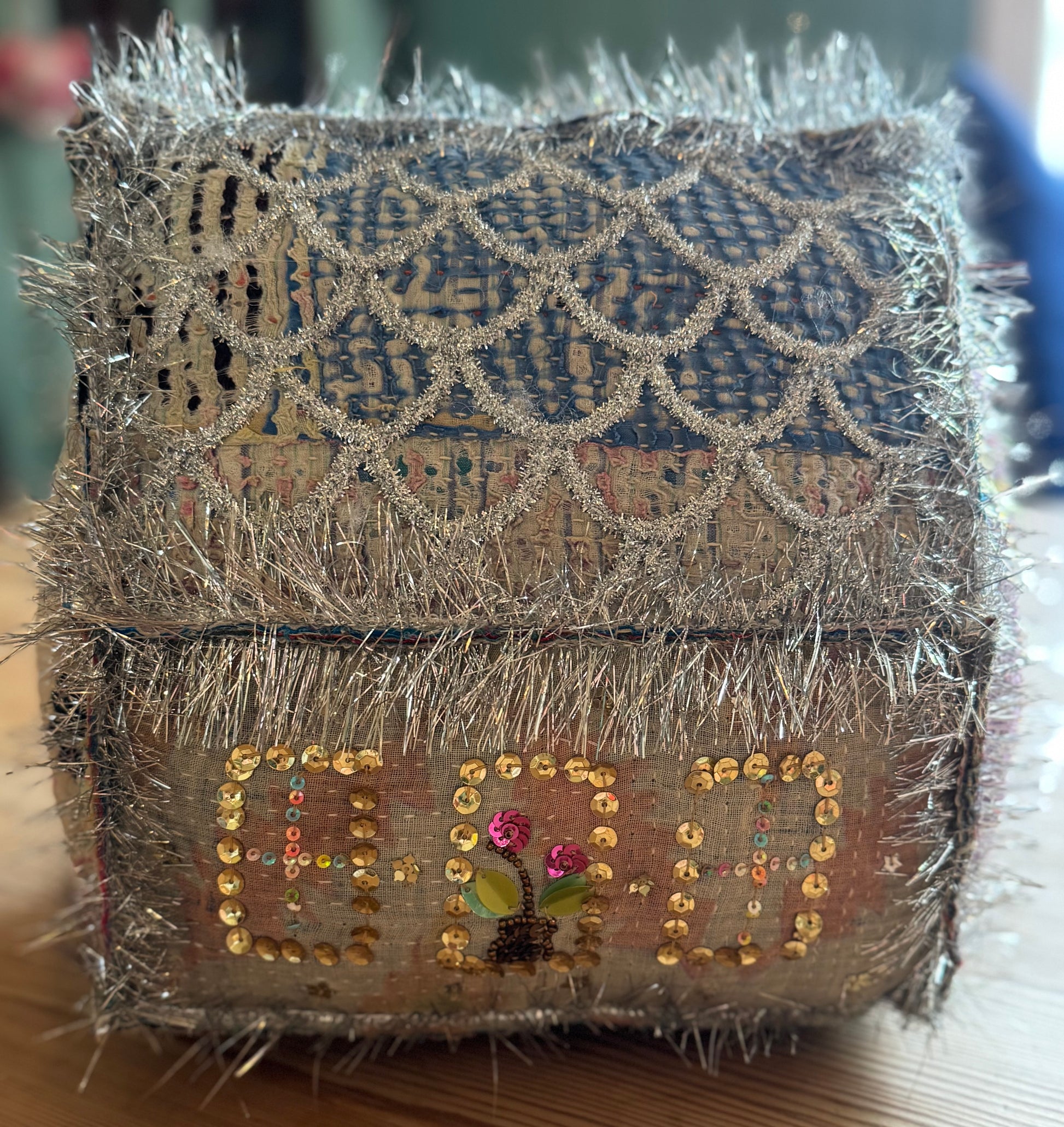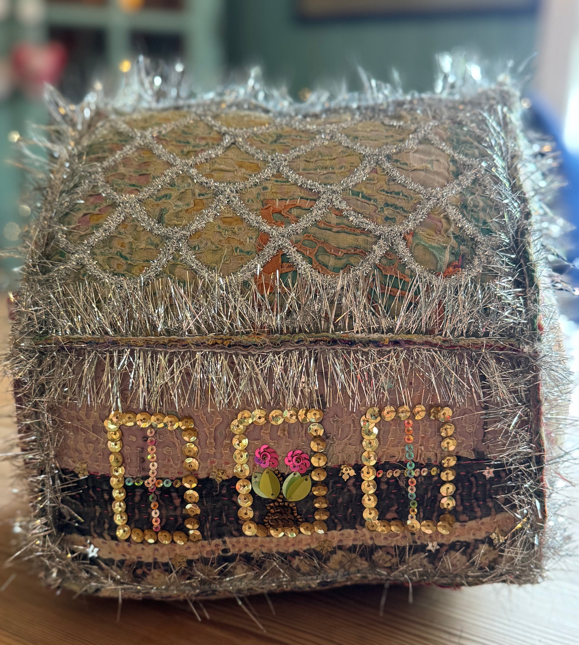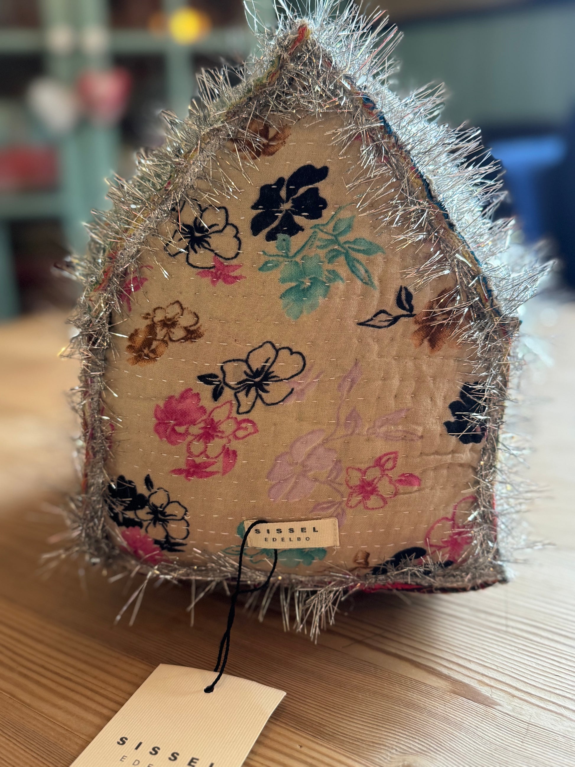 Gøyal pynt sydd for hånd , skikkelig forseggjort hus med mange små perler og annen påsydd pynt. Båndet er i sølvfrynser og krans på døren med perler og strass