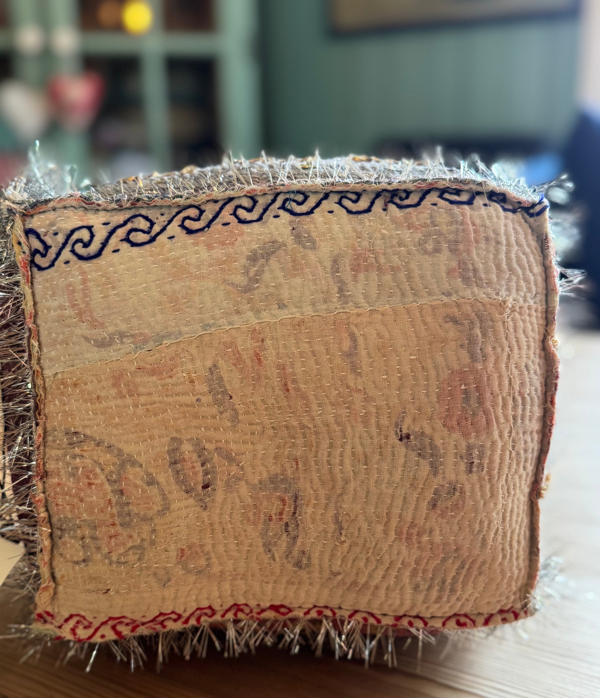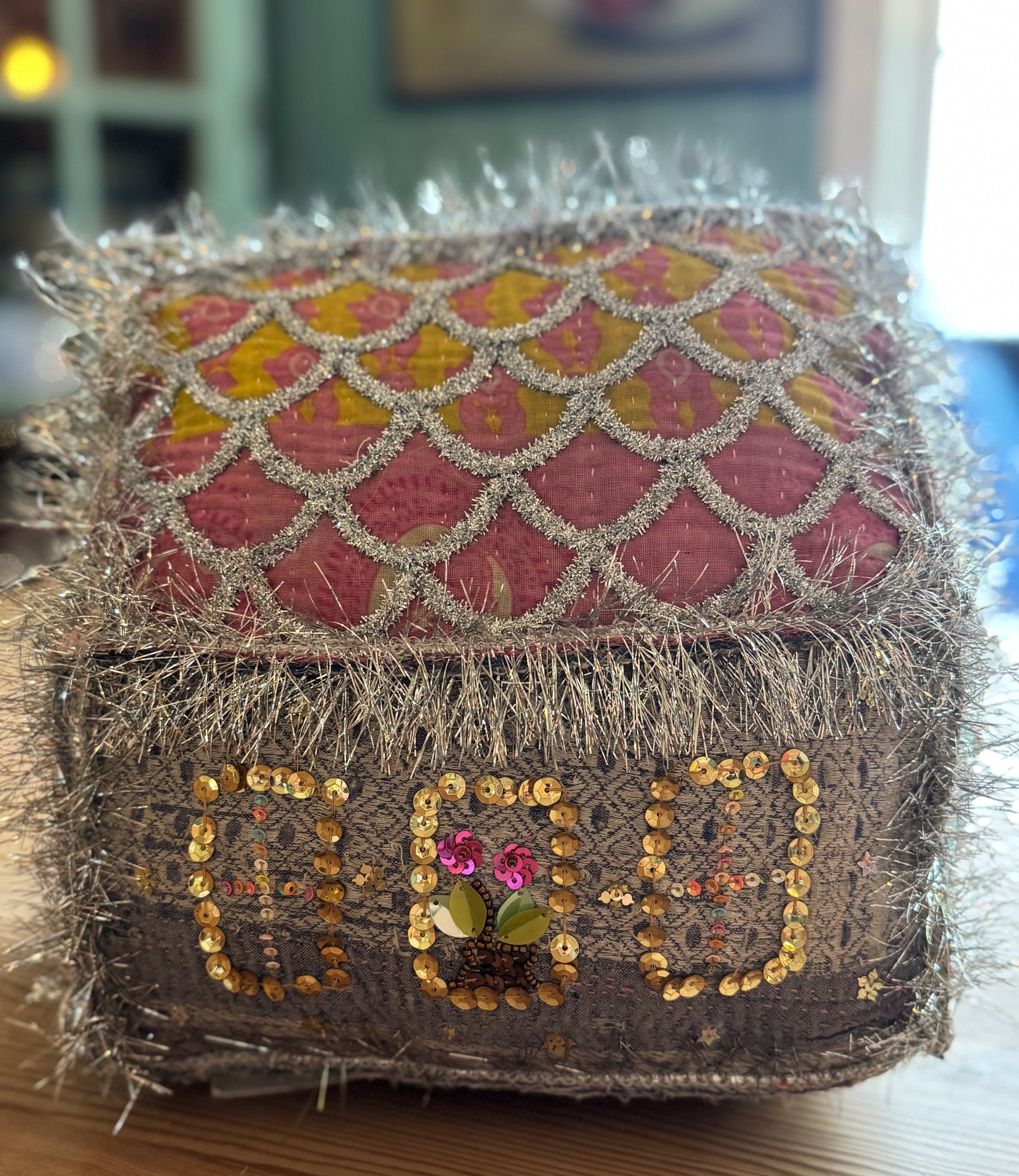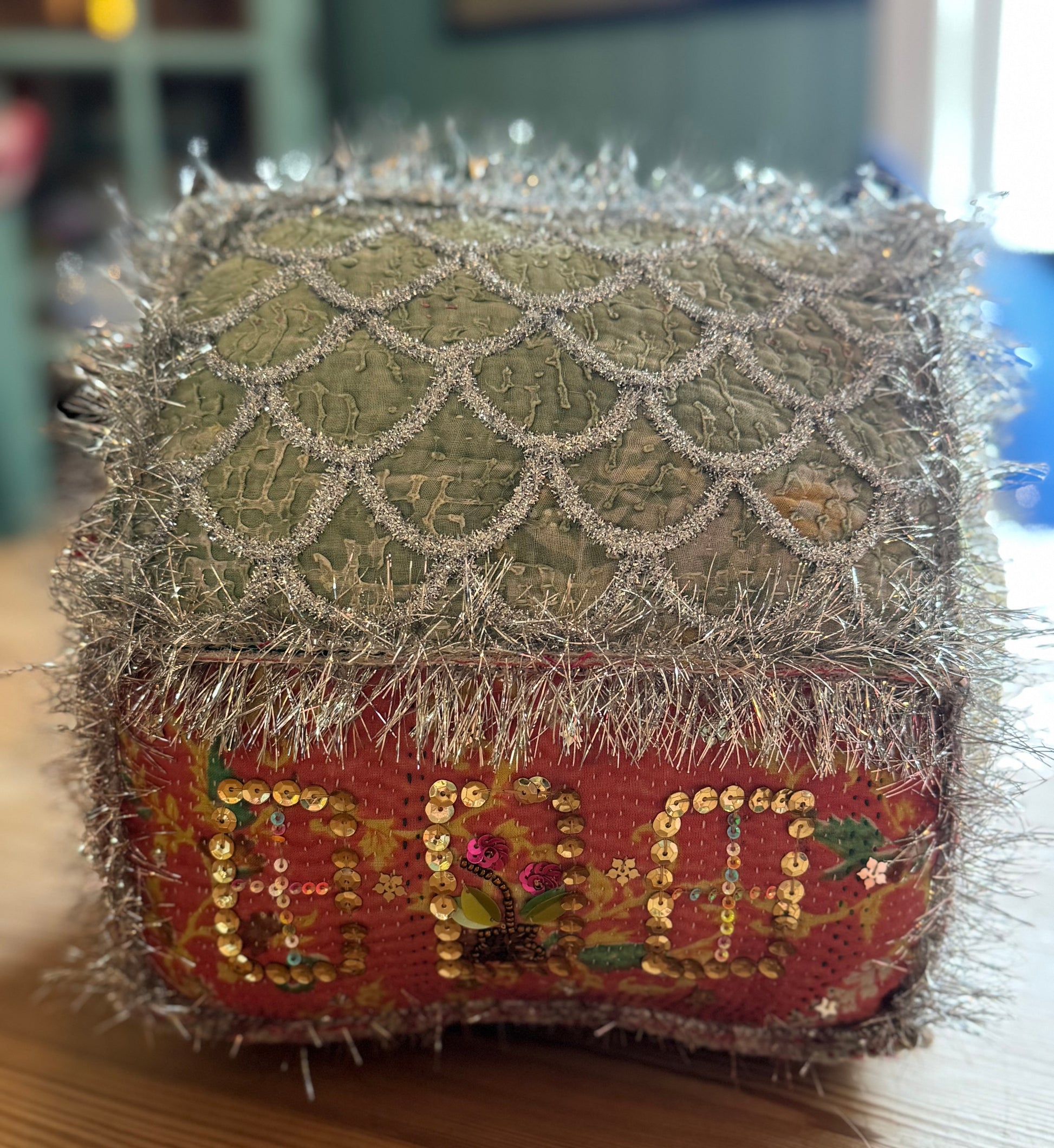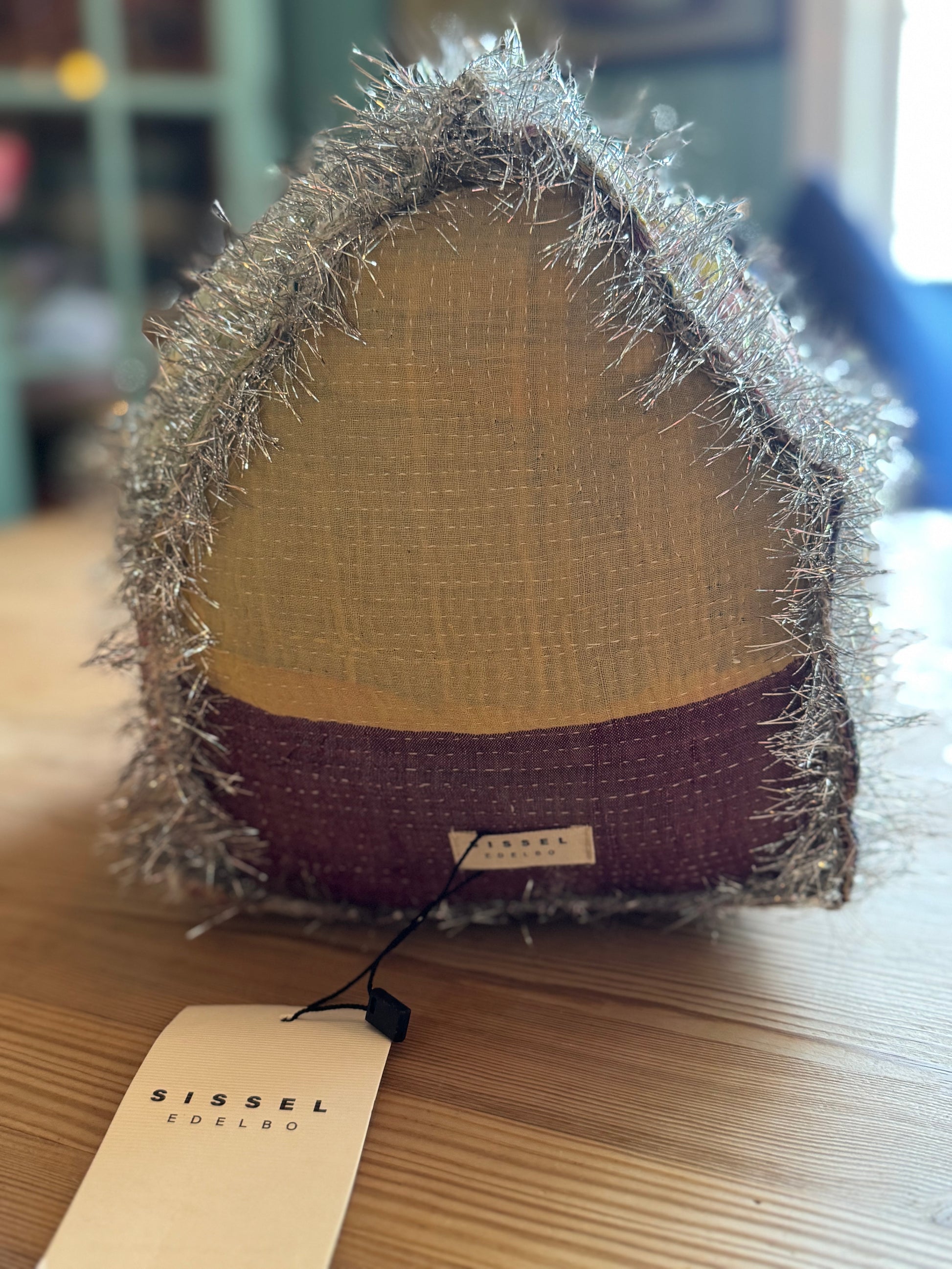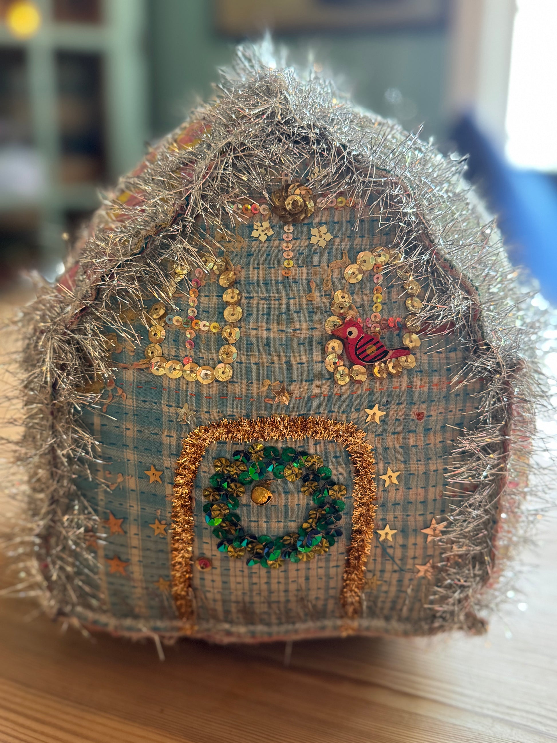 Gøyal pynt sydd for hånd , skikkelig forseggjort hus med mange små perler og annen påsydd pynt. Båndet er i sølvfrynser og krans på døren med perler og strass