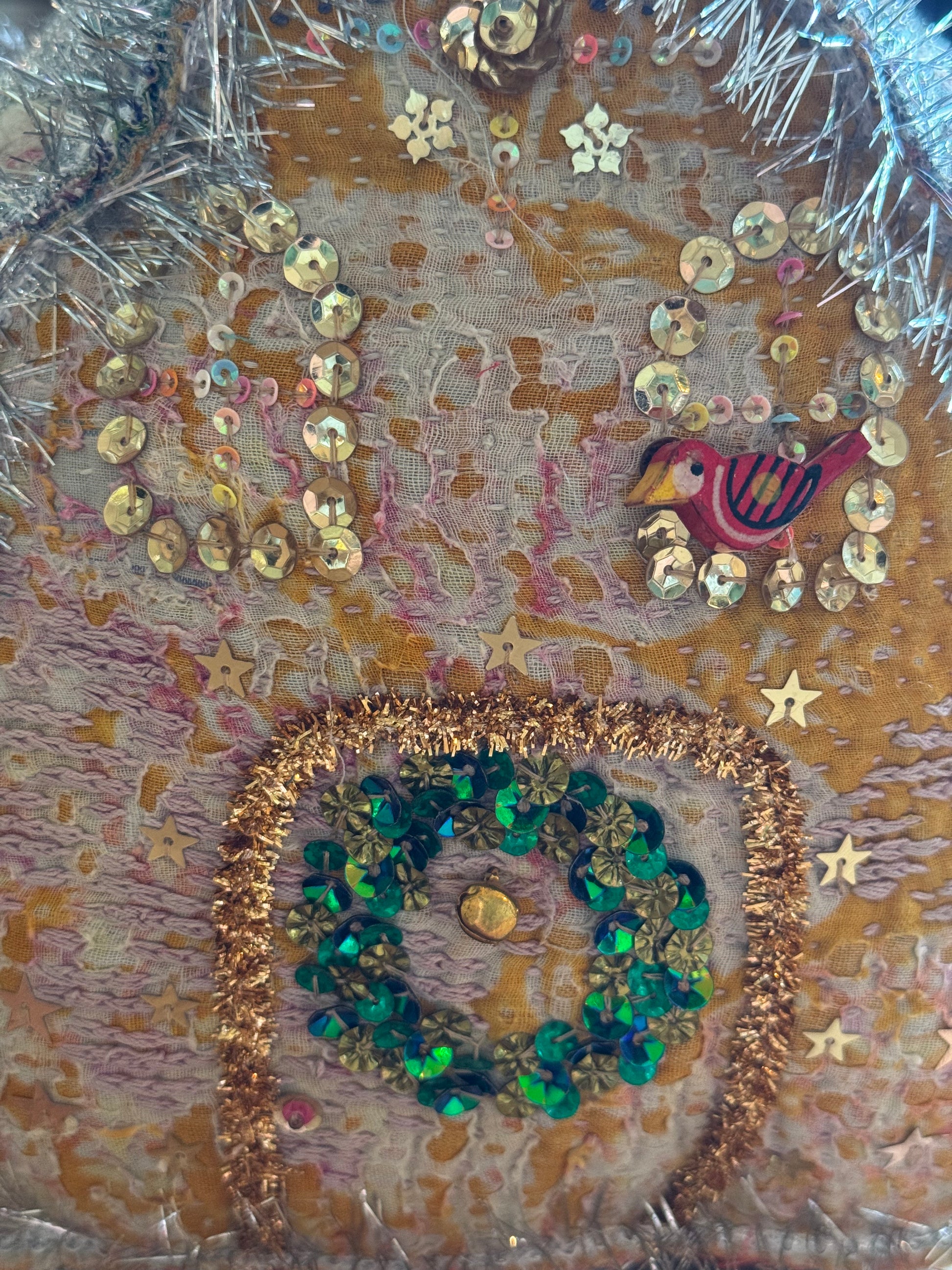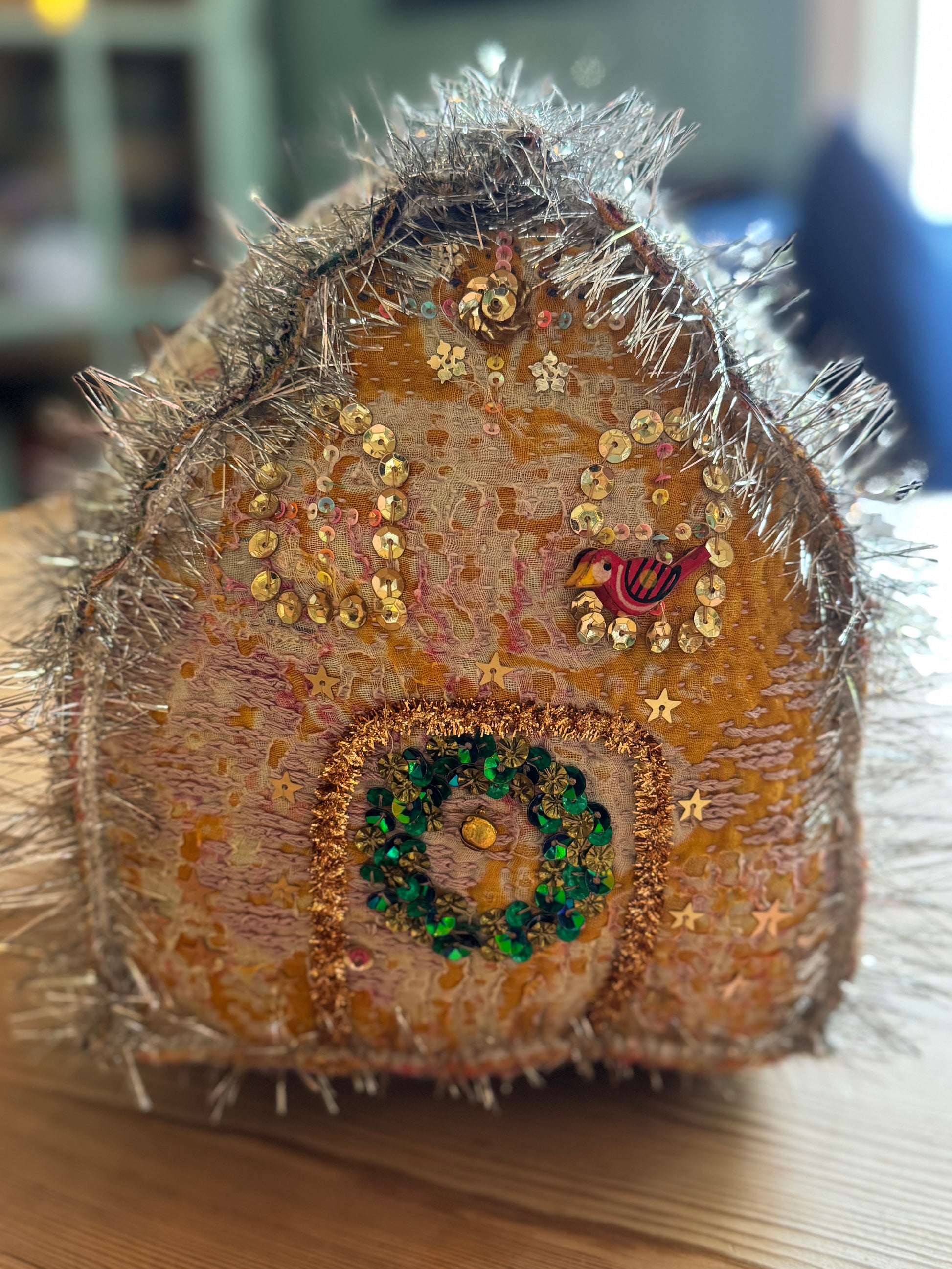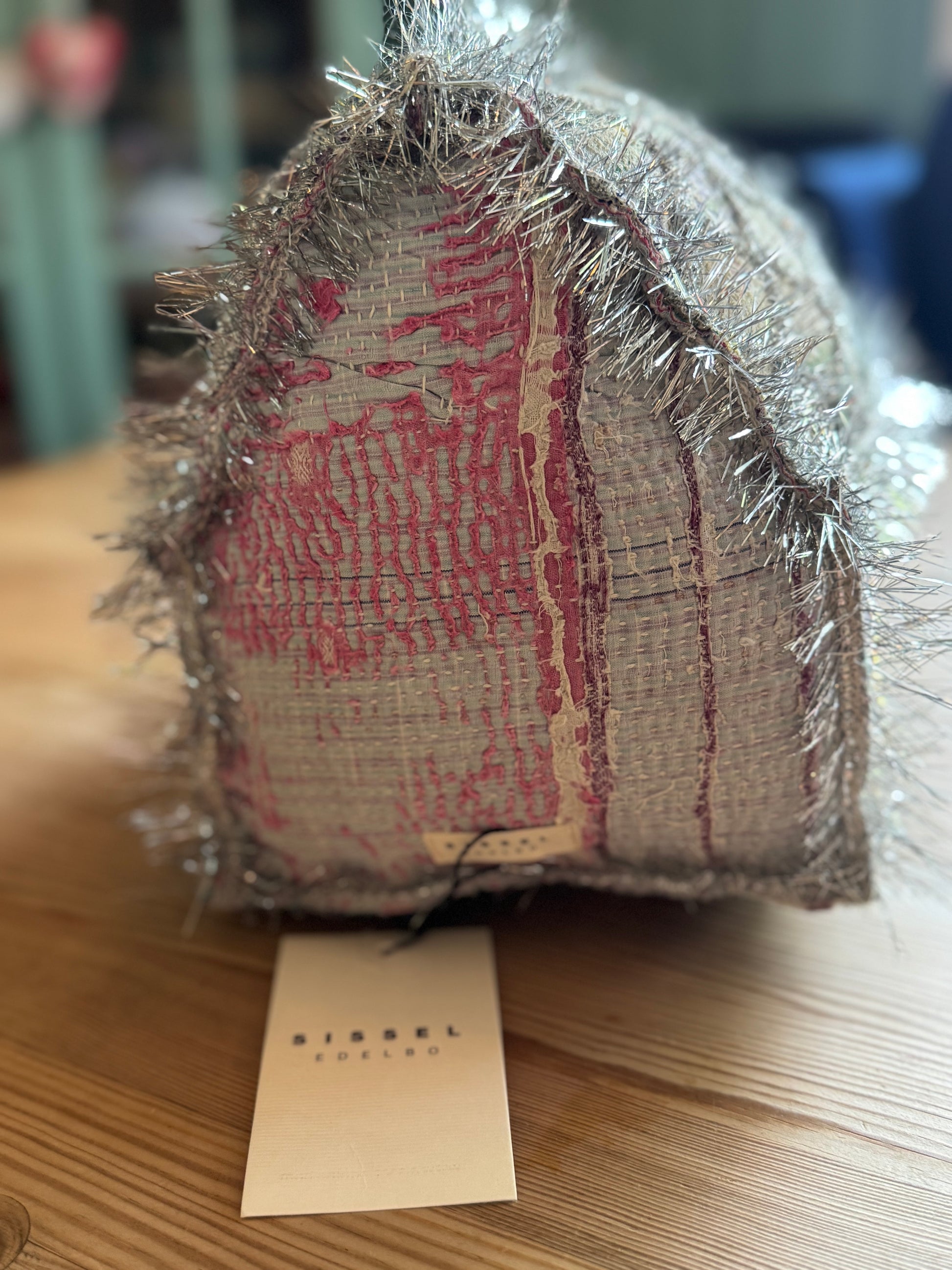 Gøyal pynt sydd for hånd , skikkelig forseggjort hus med mange små perler og annen påsydd pynt. Båndet er i sølvfrynser og krans på døren med perler og strass