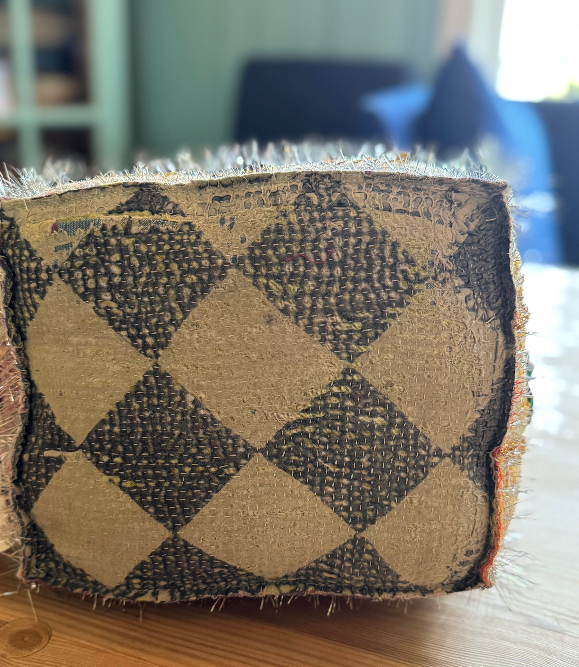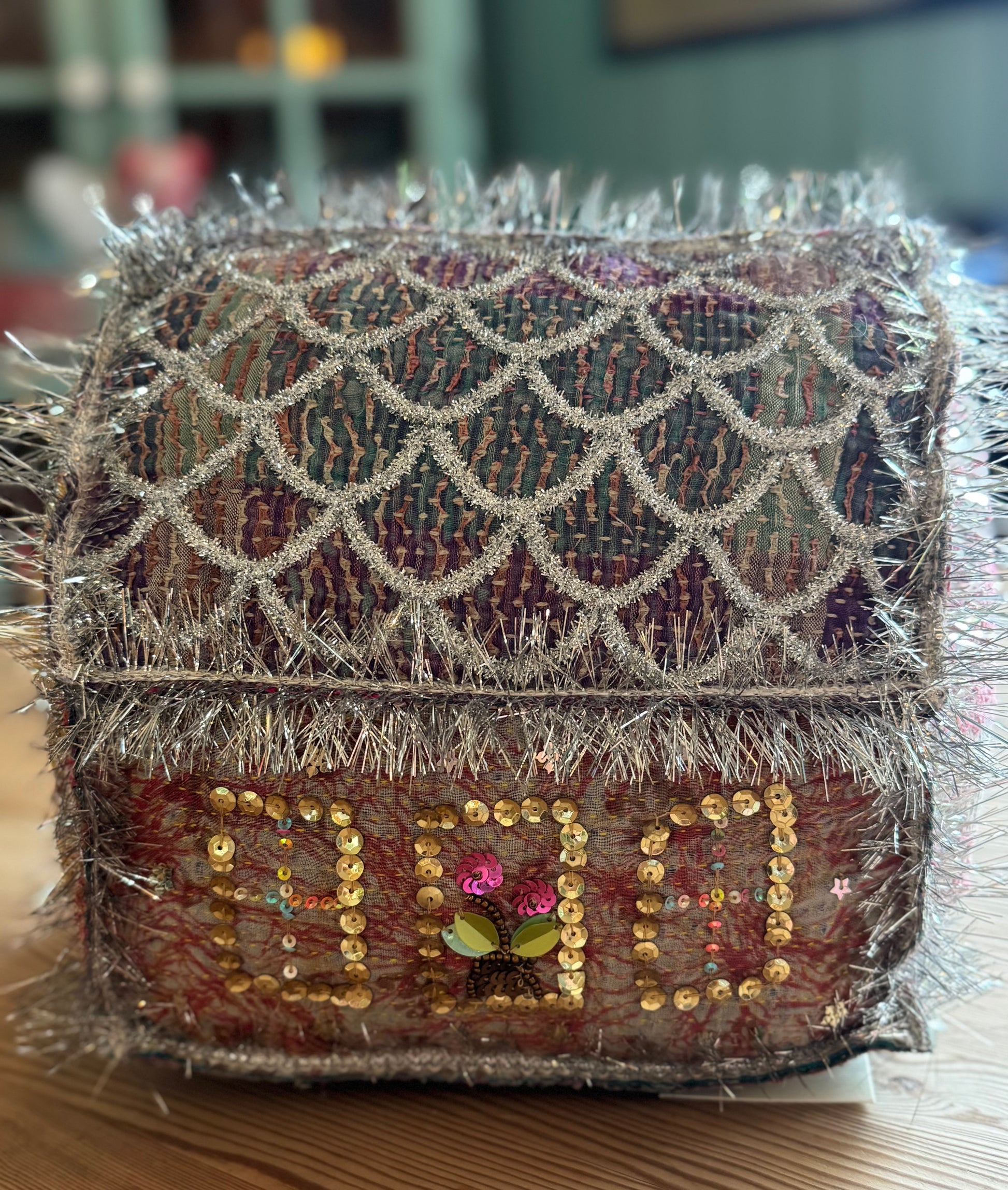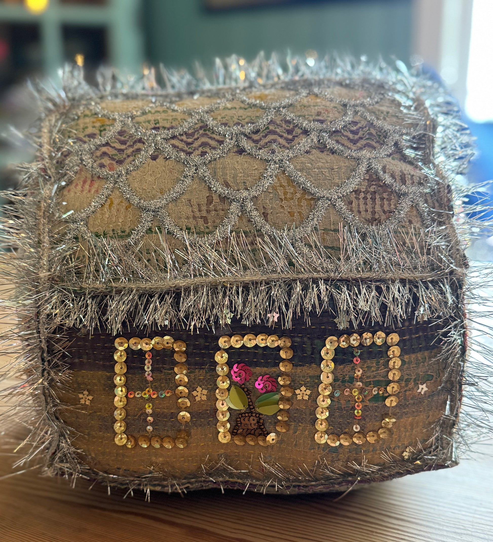 Gøyal pynt sydd for hånd , skikkelig forseggjort hus med mange små perler og annen påsydd pynt. Båndet er i sølvfrynser og krans på døren med perler og strass