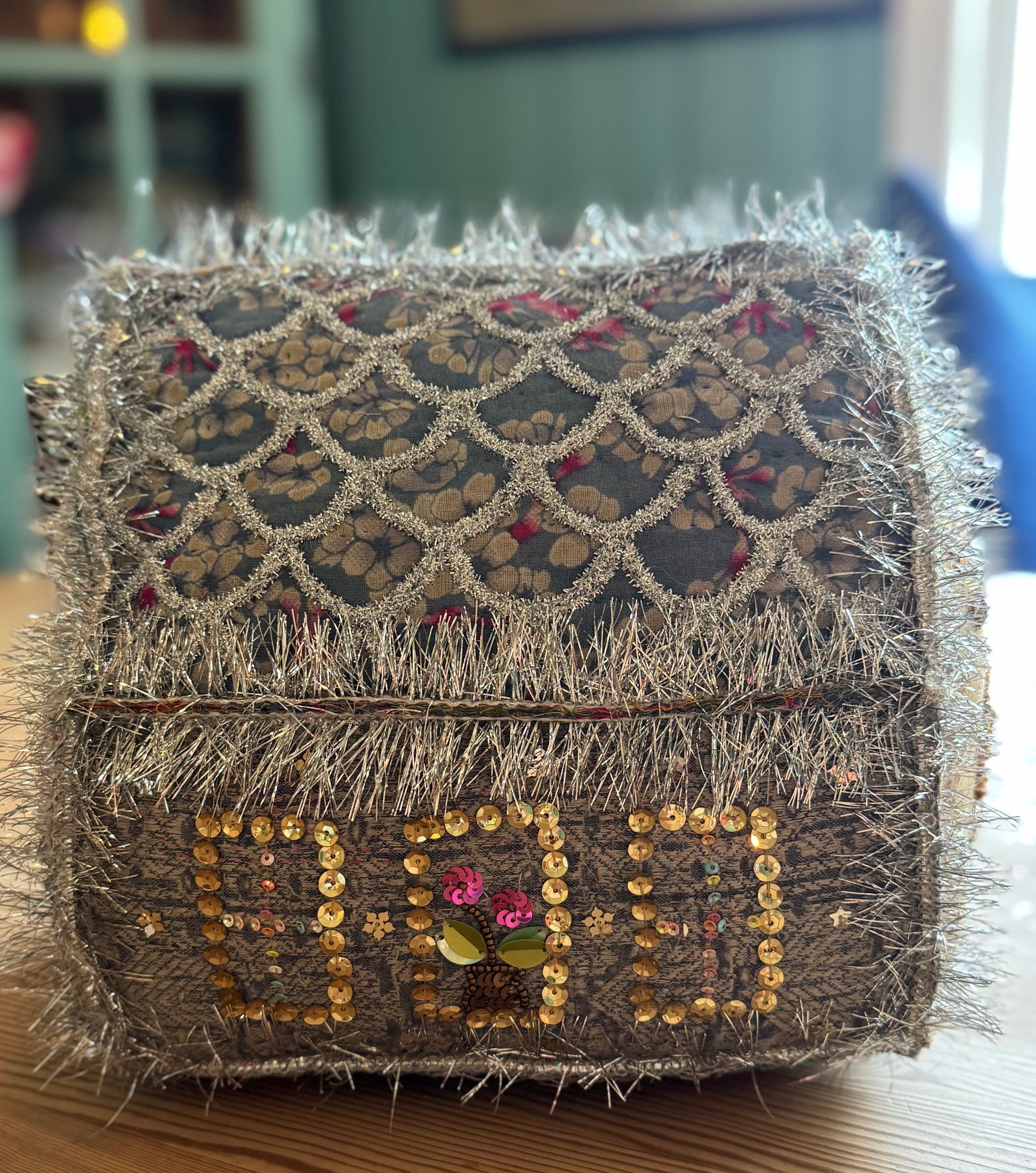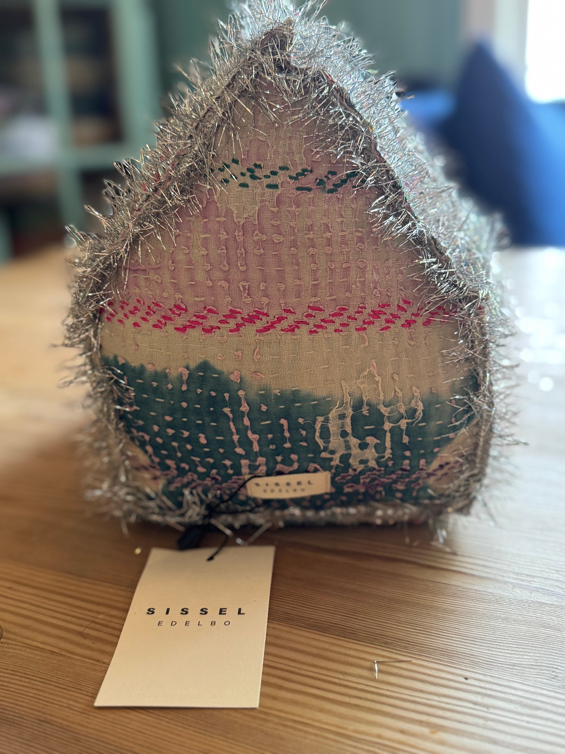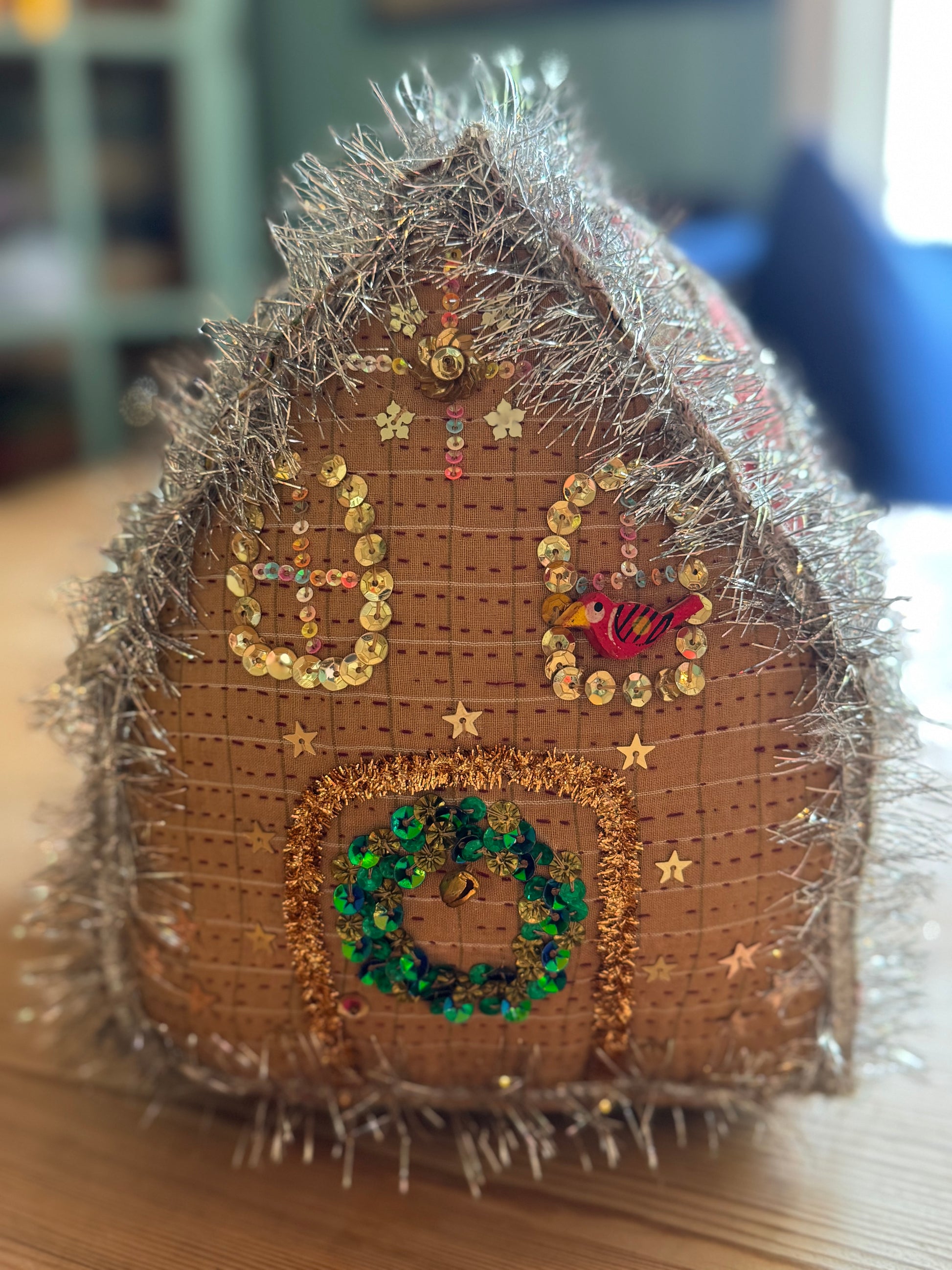 Gøyal pynt sydd for hånd , skikkelig forseggjort hus med mange små perler og annen påsydd pynt. Båndet er i sølvfrynser og krans på døren med perler og strass