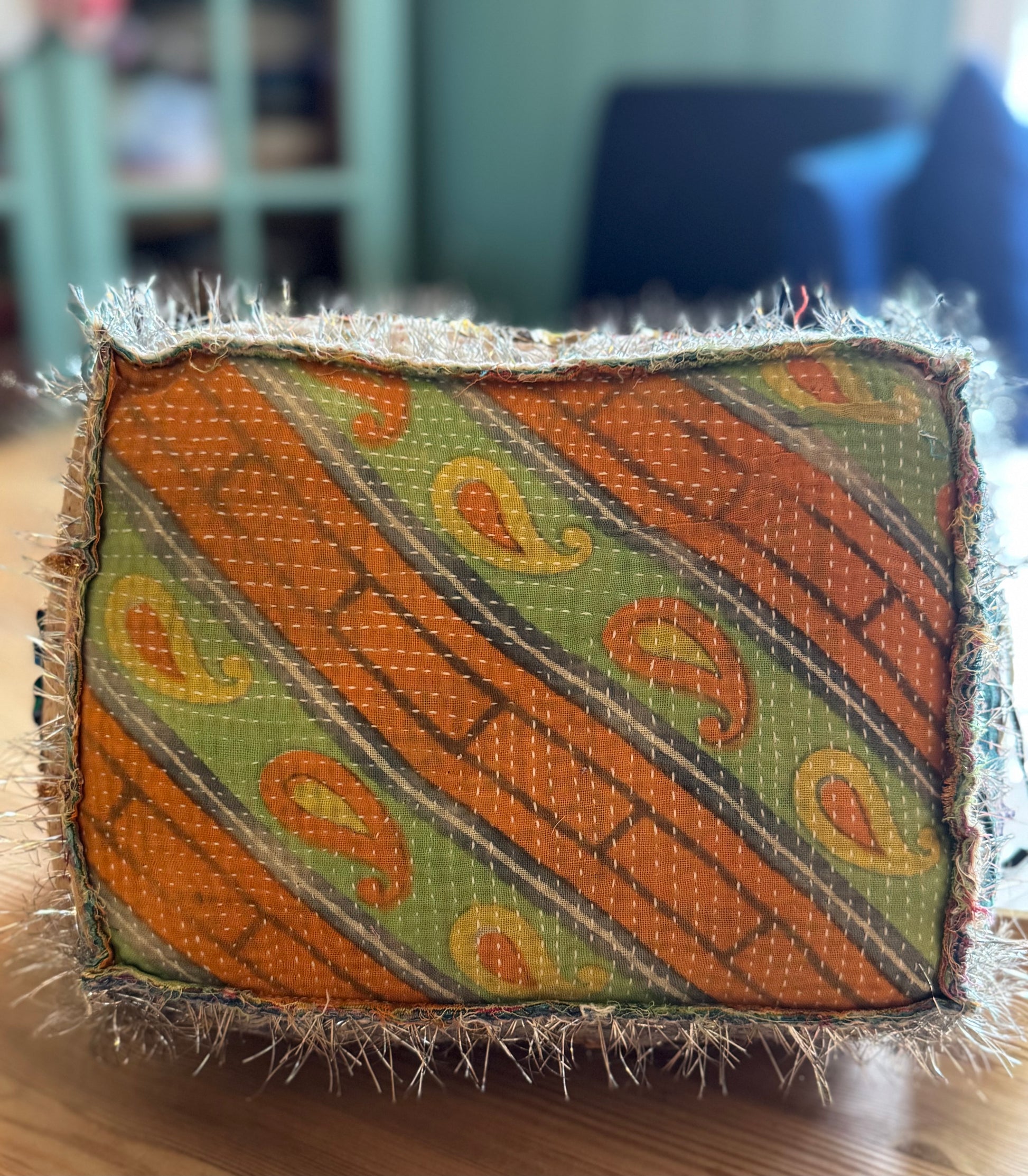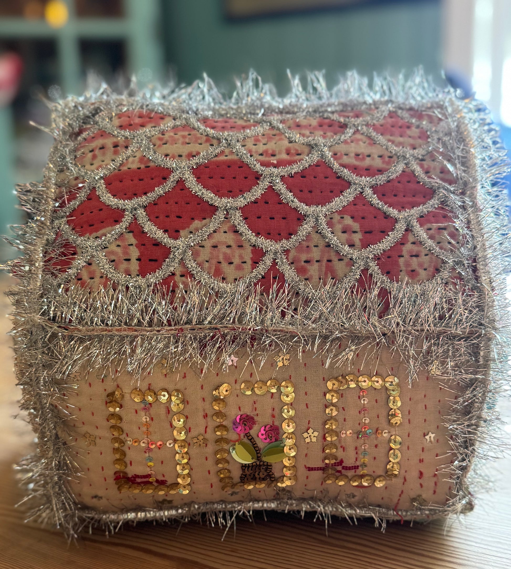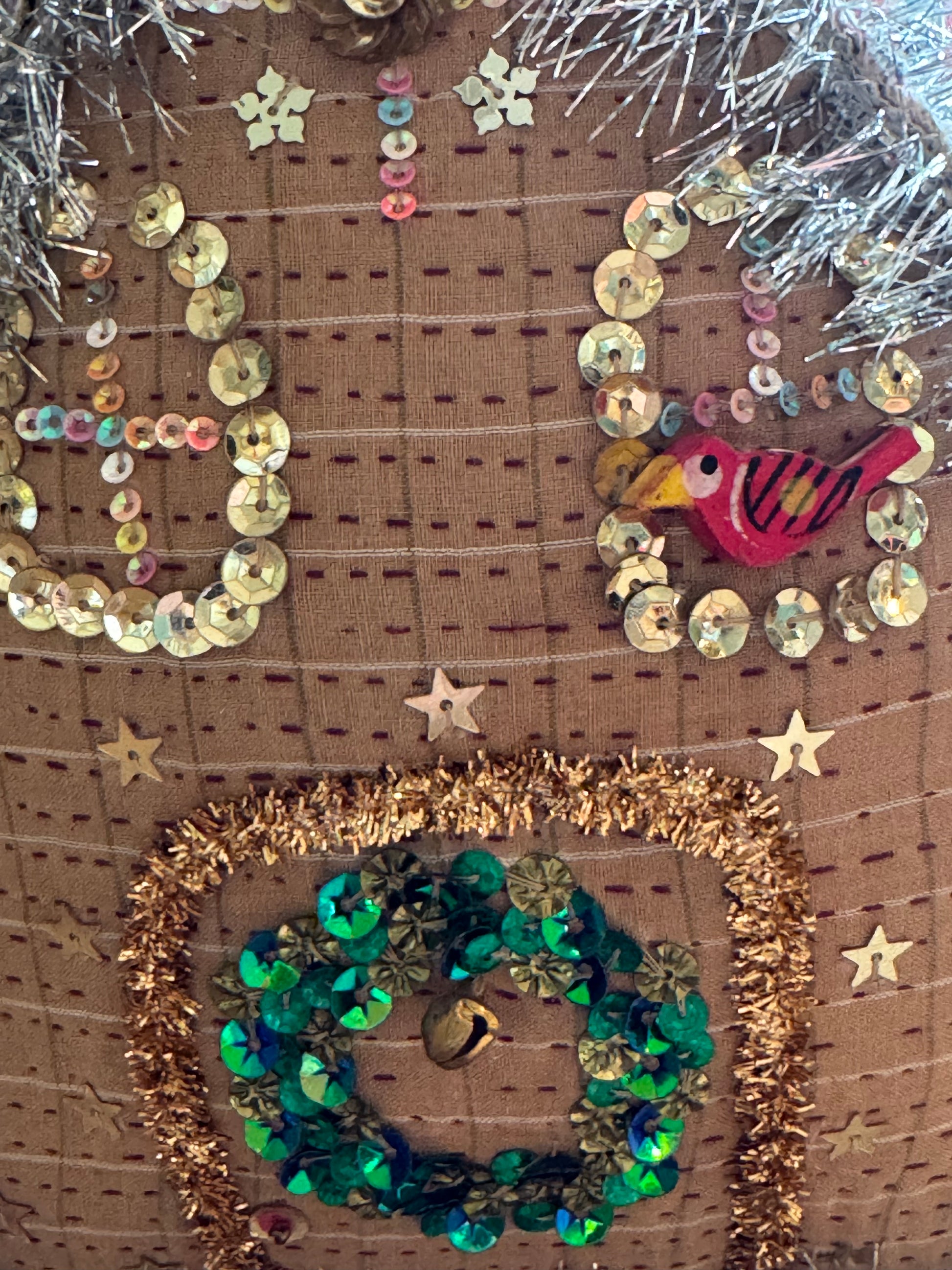 Gøyal pynt sydd for hånd , skikkelig forseggjort hus med mange små perler og annen påsydd pynt. Båndet er i sølvfrynser og krans på døren med perler og strass