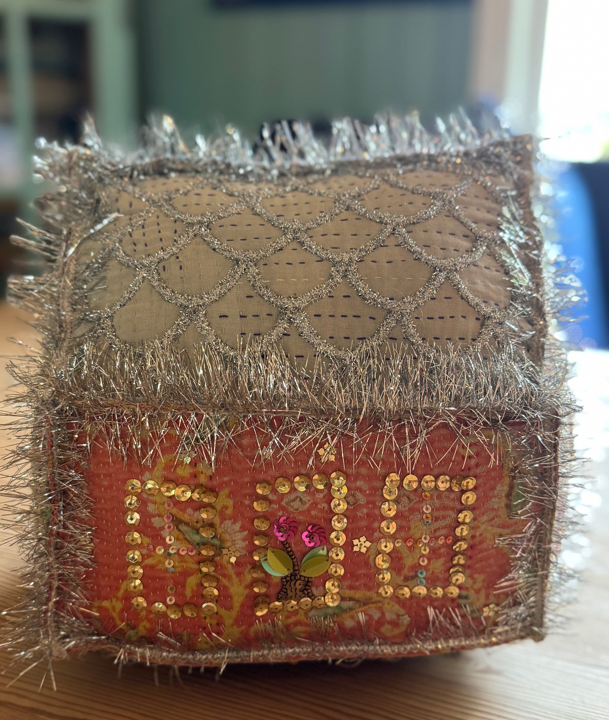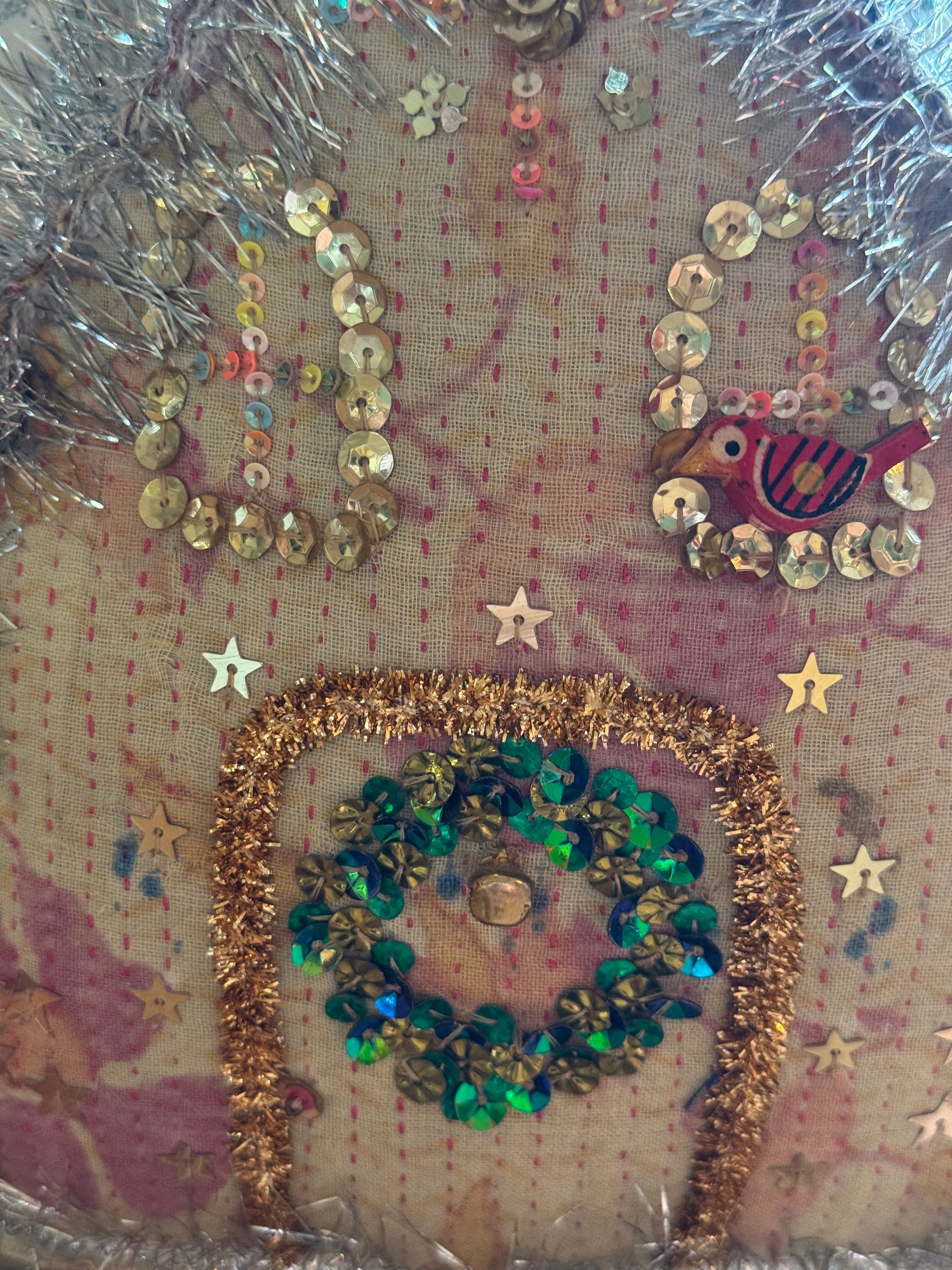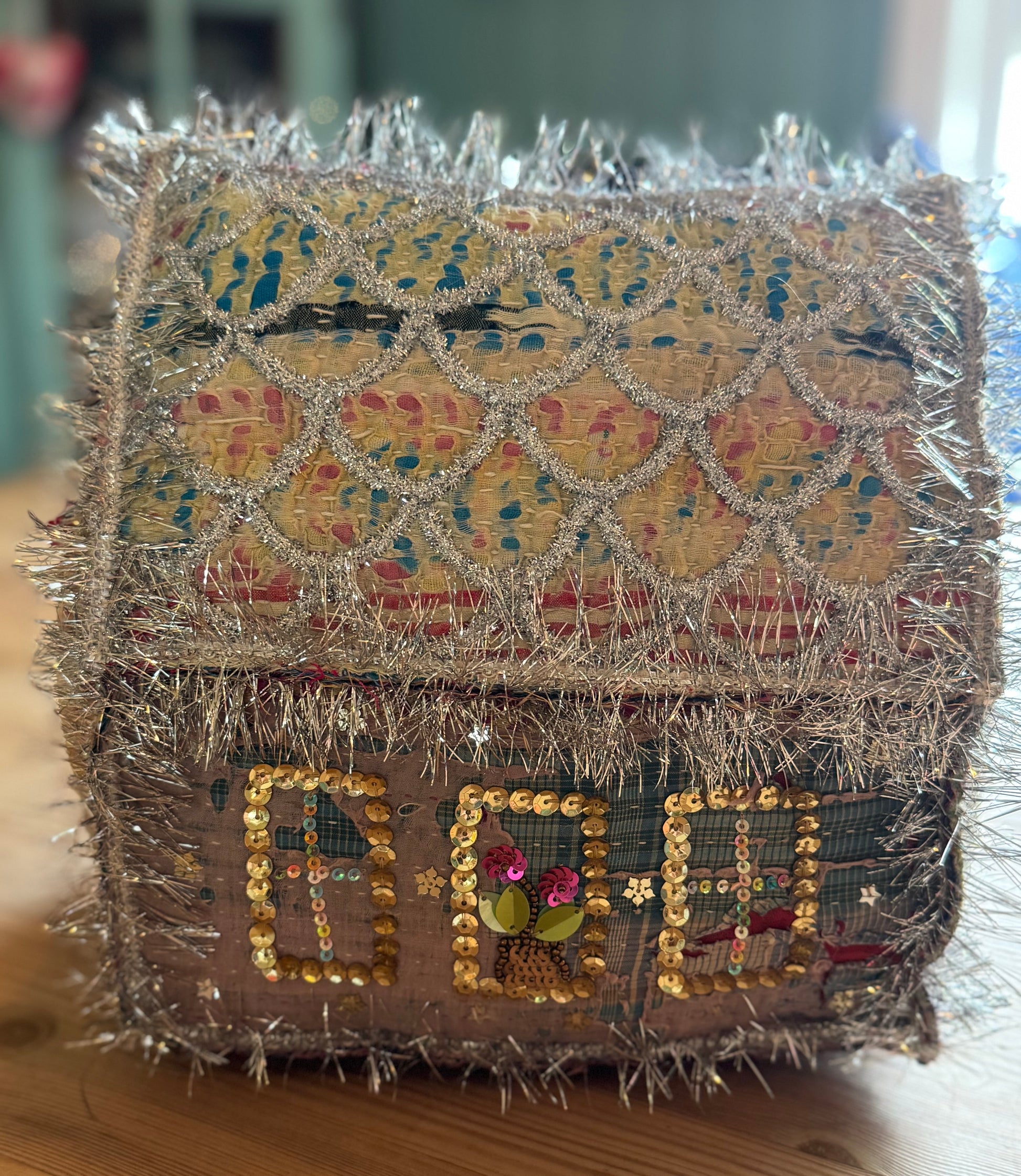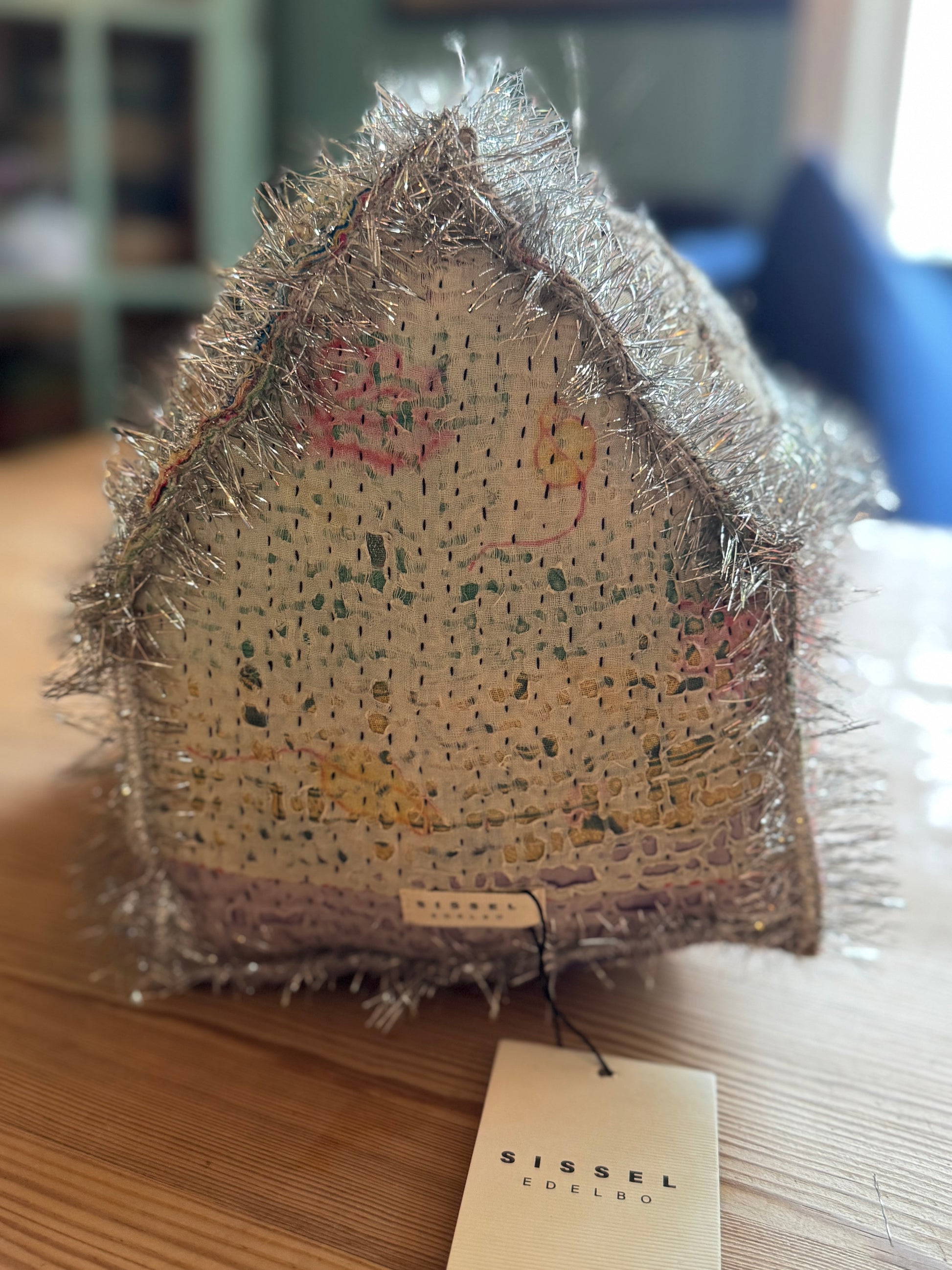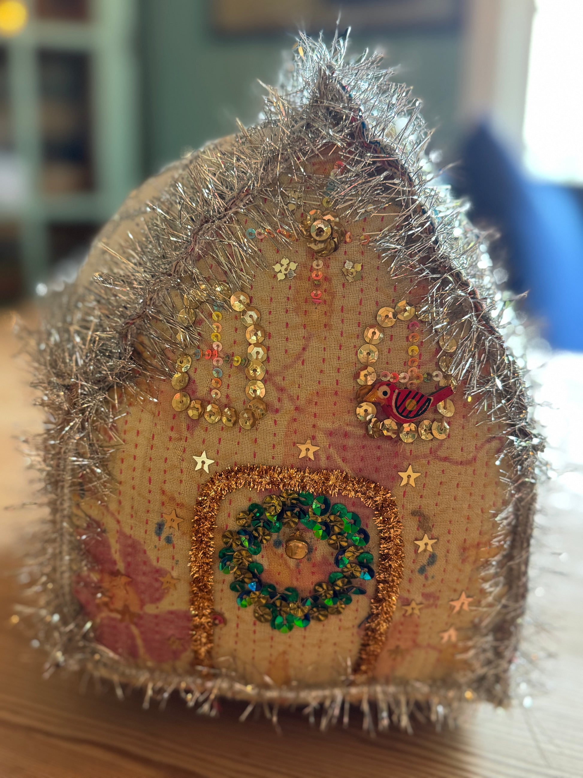 Gøyal pynt sydd for hånd , skikkelig forseggjort hus med mange små perler og annen påsydd pynt. Båndet er i sølvfrynser og krans på døren med perler og strass
