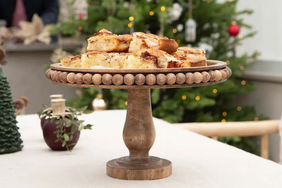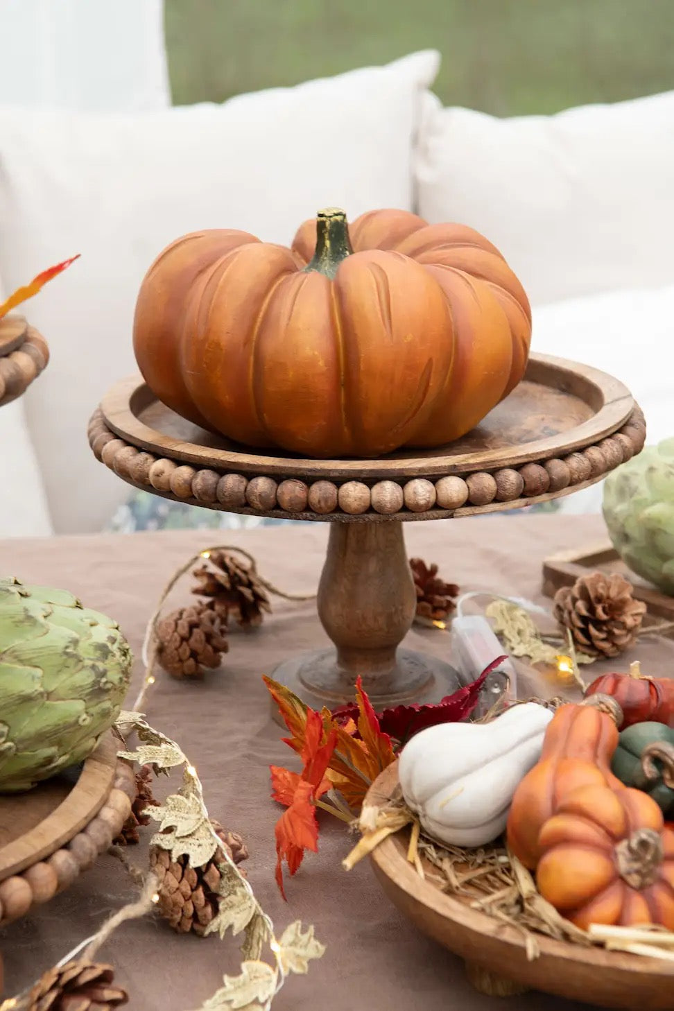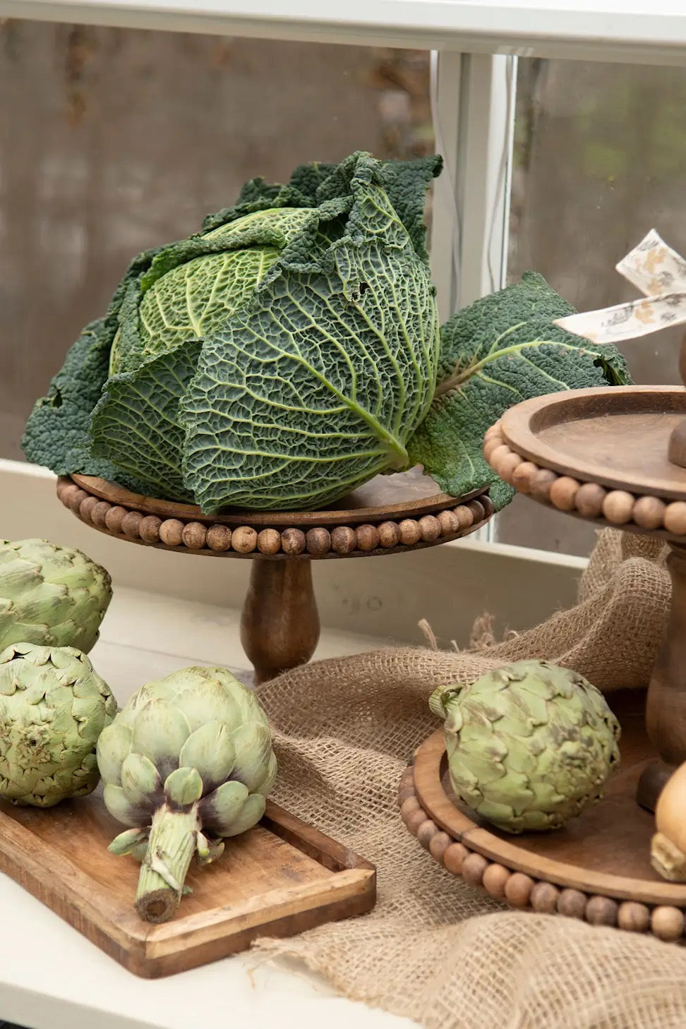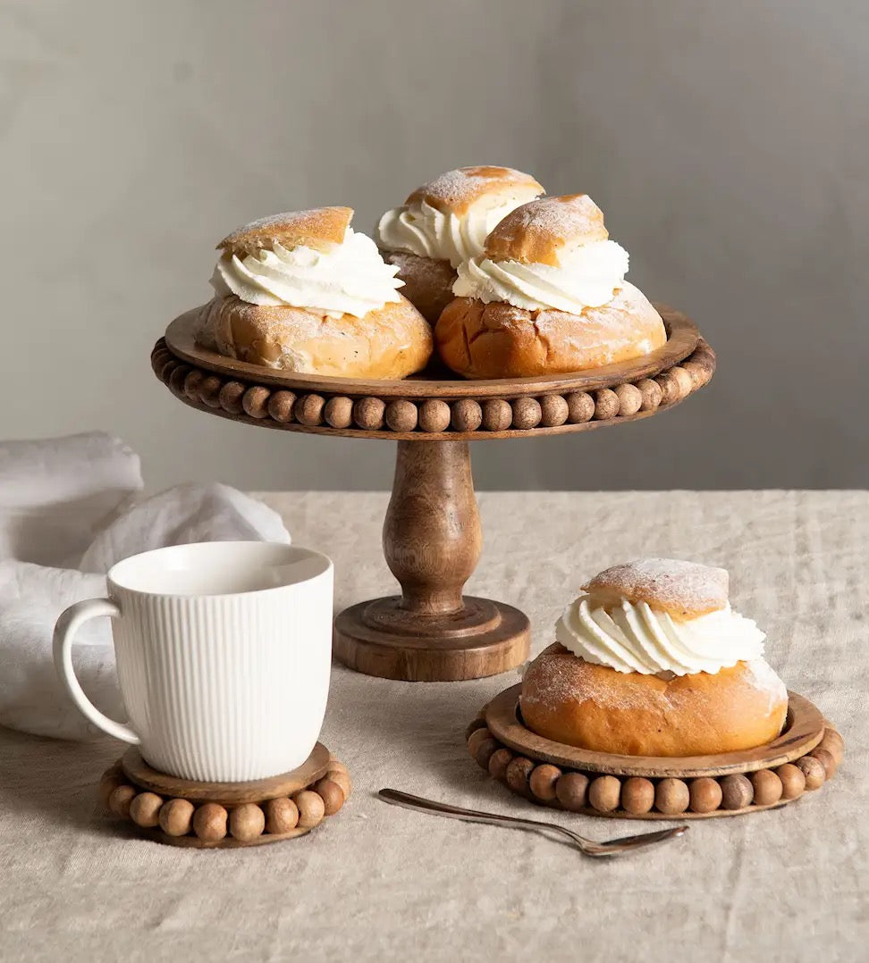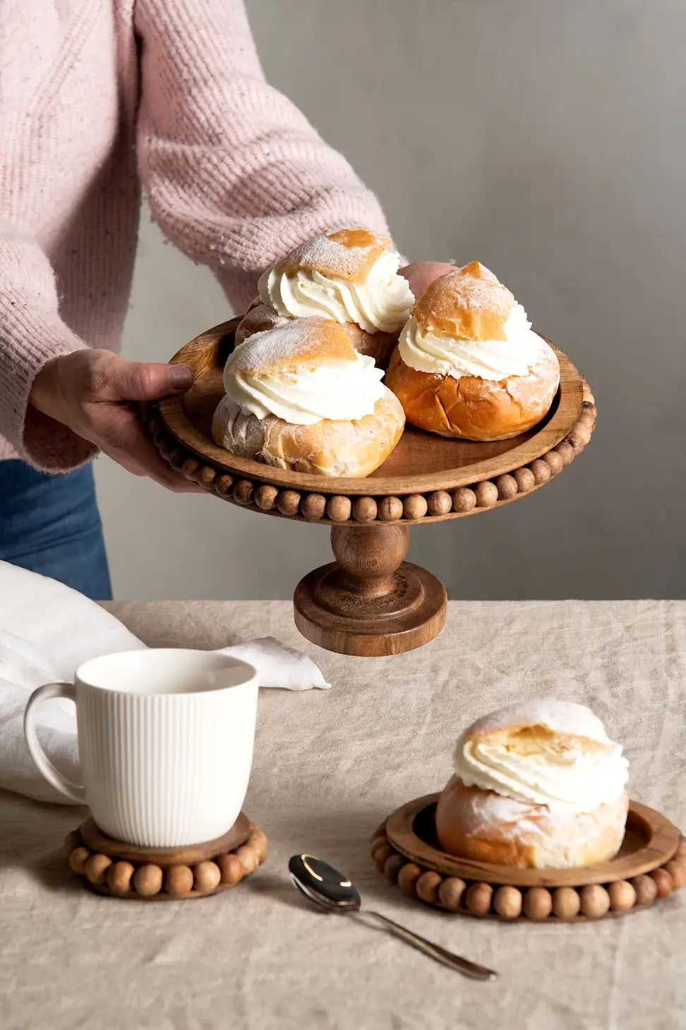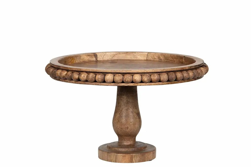 Fat på fot med en kant av trekuler. Passer like bra til serveringsfat som til dekorasjoner. laget i mangotre